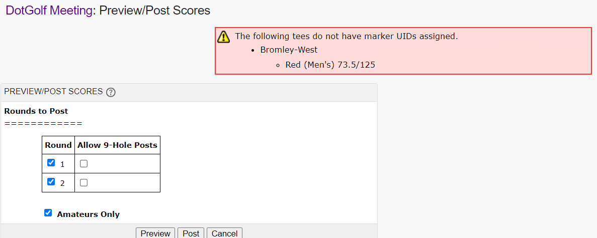 Note- If you see any error messages appear, the tees are not setup properly for the scores to post successfully. The error would have to be identified, and fixed.