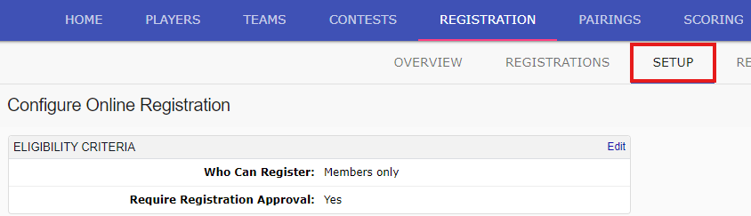 Within the tournament, go to the registration tab, and the sub-tab "Setup":